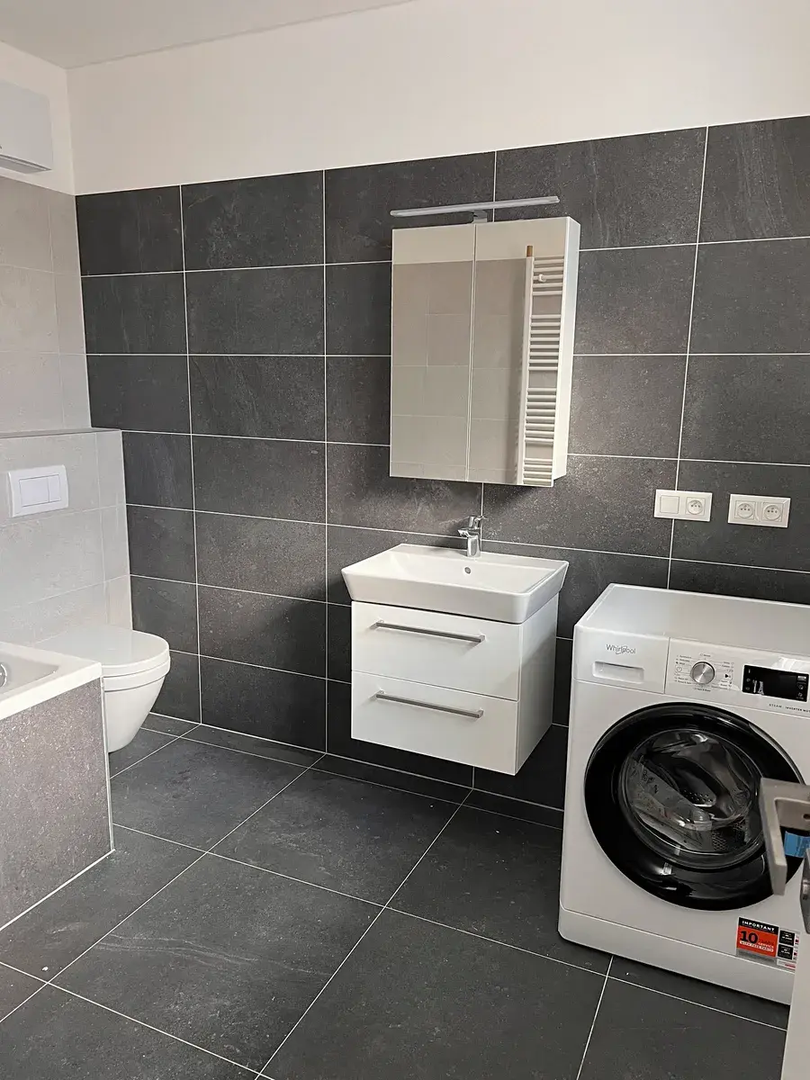 V bytě se nachází zcela nová kuchyňská linka s vestavěnými spotřebičemi zn. Whirpool, prostornou koupelnou s pračkou zn. Whirpool.