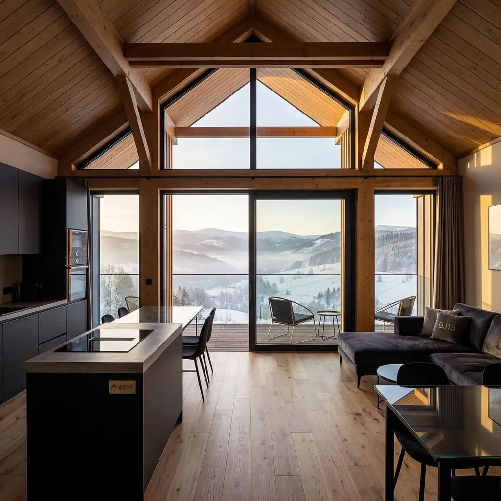 Obývací pokoj je propojen s lodžií orientovanou na jih, která poskytuje příjemné místo pro ranní kávu nebo odpočinek po dni stráveném na horách. Samostatná ložnice nabízí klidné zázemí pro odpočinek.