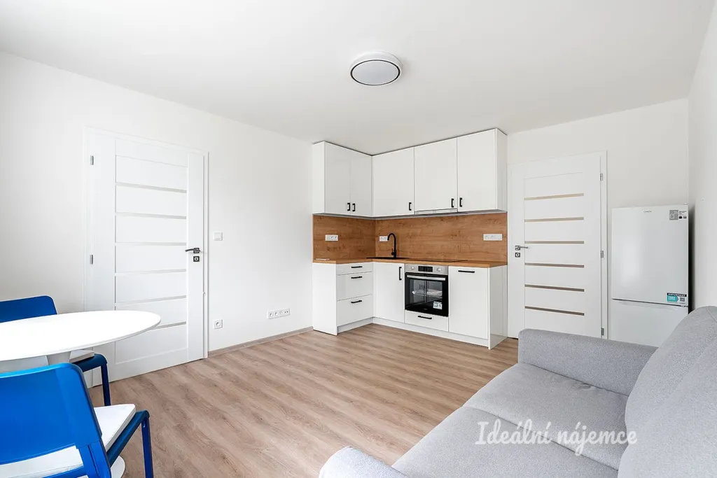 Kuchyňský kout je plně vybaven kvalitní kuchyňskou linkou se všemi spotřebiči – lednicí s mrazákem, myčkou, elektrickou troubou, varnou deskou a digestoří. Obývací část je zařízena pohovkou, konferenčním stolkem a jídelním stolem se židlemi. Ložnice zůstává nezařízená a nabízí prostor pro vlastní řešení spaní dle preferencí.