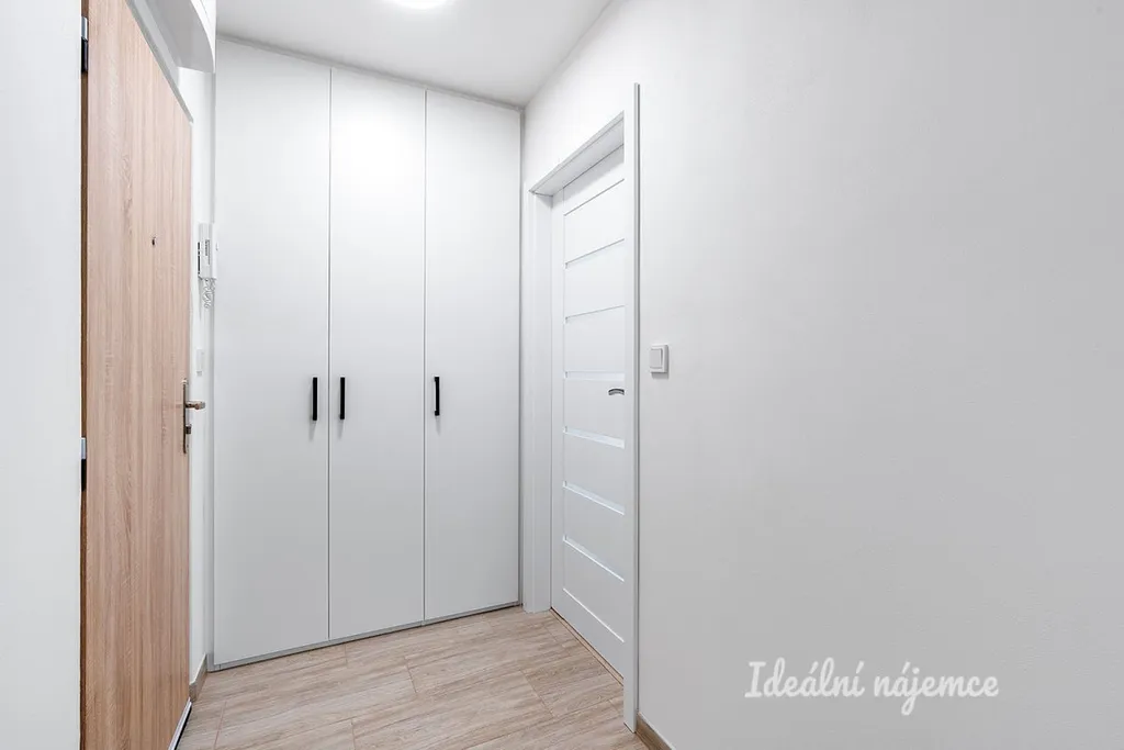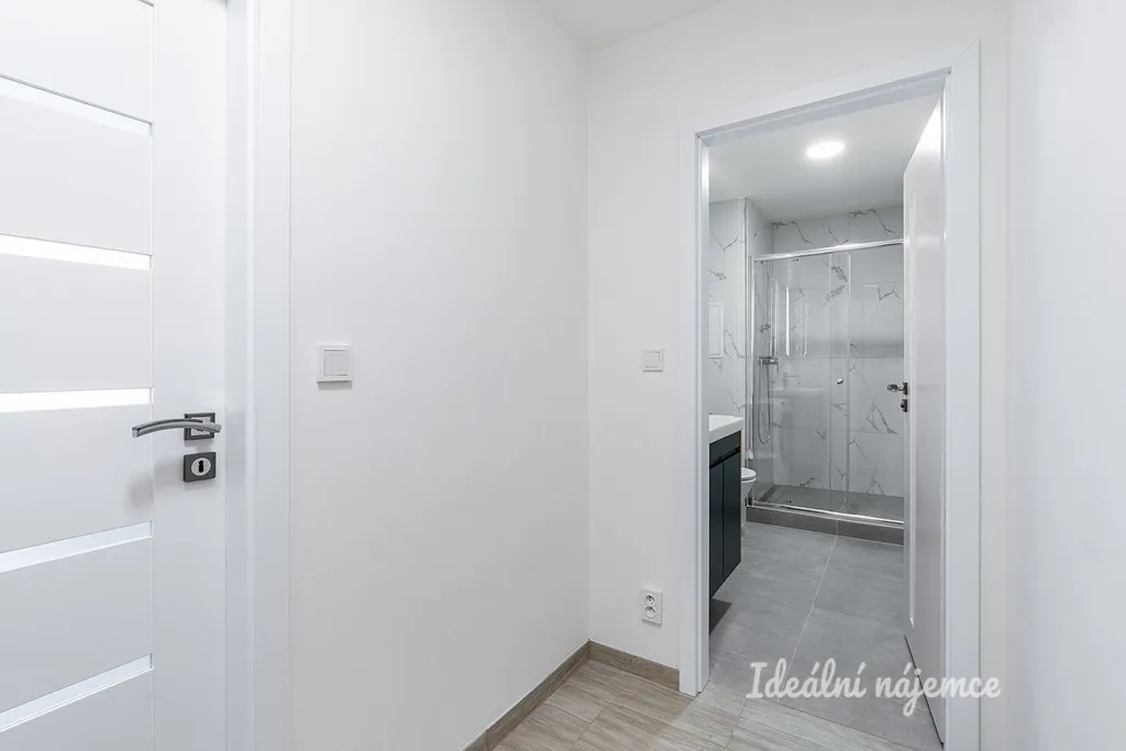 V koupelně se nachází sprchový kout, umyvadlo, koupelnová skříňka, zrcadlo, pračka a WC. V předsíni je praktická vestavěná skříň.