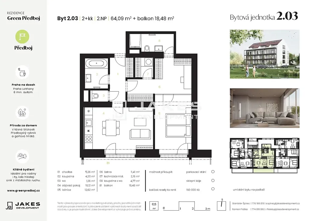 Nabízíme k prodeji byt 2+kk o velikosti 64,09 m² s balkonem o velikosti 18,48 m², nacházející se v 2. nadzemním podlaží Rezidence Green Předboj. Byt bude dokončen ve vysokém standardu – kvalitní vinylové podlahy, moderní interiérové dveře a elegantní koupelna s keramickým obkladem a sanitou značky Laufen. Komfort zajišťuje podlahové vytápění, které přispívá k příjemné atmosféře i nízkým provozním nákladům.
