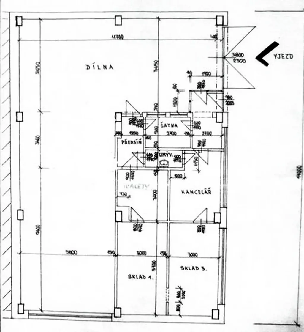 -skládá se z : hala 150 m², 2 prostorné kanceláře s okny, 2 menší místnosti / sklady/ s možností instalace kuchyňské linky, koupelnu, 2x WC (1 původní, 1 nová kombi), sprchový kout, možnost vybudovat výlevku, nové umyvadlo se skříňkou.