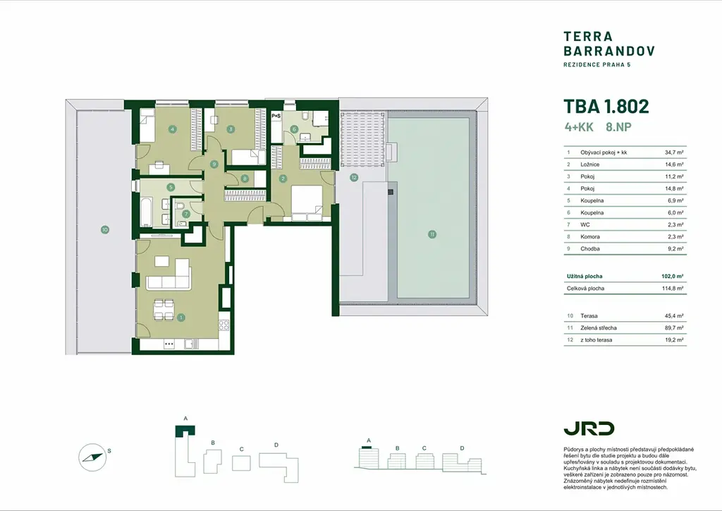 Nabízíme výjimečný byt 4+kk v 8. nadzemním podlaží nového projektu Terra Barrandov. Dispozice zahrnuje velký obývací pokoj s kuchyňským koutem, tři samostatné pokoje, dvě koupelny, samostatné WC, komoru a prostornou chodbu s dostatkem místa pro úložná řešení. Jedinečným benefitem bytu je terasa o výměře 45,4 m2 a soukromá zelená střecha o výměře 89,7 m2, jejíž součástí je další terasa. K bytu náleží sklepní kóje, garážové stání je možné dokoupit.