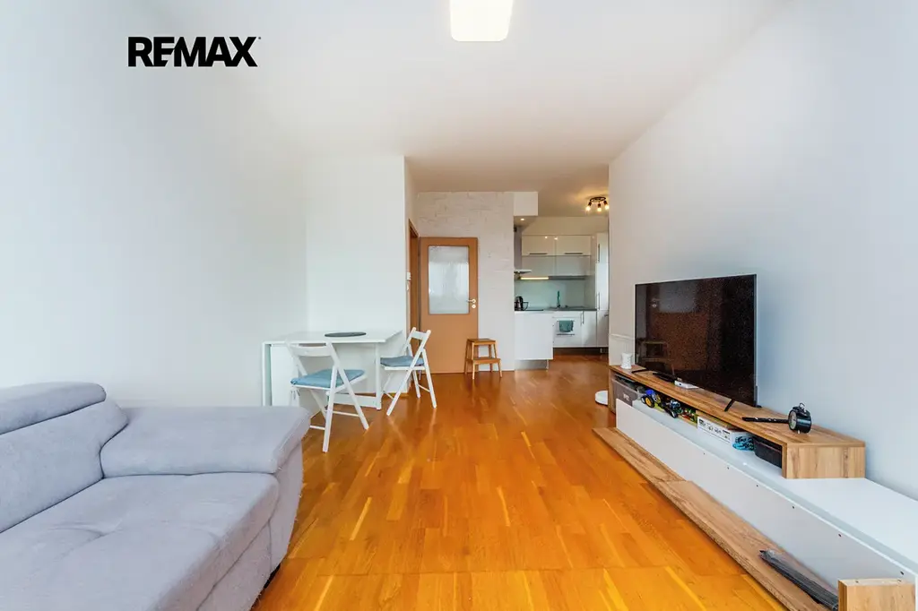 Dispozice bytu je velmi praktická. Vstupní chodba nabízí dostatek úložného prostoru, dále je zde samostatný pokoj s velkou vestavěnou skříní. Byt disponuje oddělenou toaletou s umyvadlem a prostornou koupelnou s vanou, kde se nachází pračka, sušička a také plynový kotel, který zajišťuje vytápění i ohřev vody. Dominantou bytu je obývací pokoj s kuchyňským koutem, ze kterého je vstup na velkorysý balkon s příjemným výhledem.