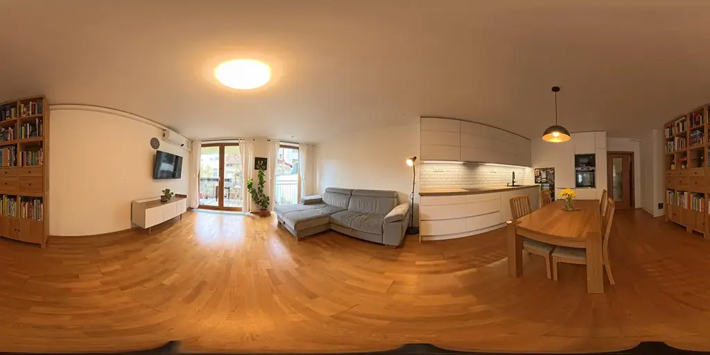 Dominantou bytu je prostorný obývací pokoj s kuchyňským koutem o výměře 34,2 m², ze kterého je přímý vstup na balkon o velikosti 7,32 m². Balkon je orientovaný na jihozápad. Na balkoně se nachází klimatizační jednotka.