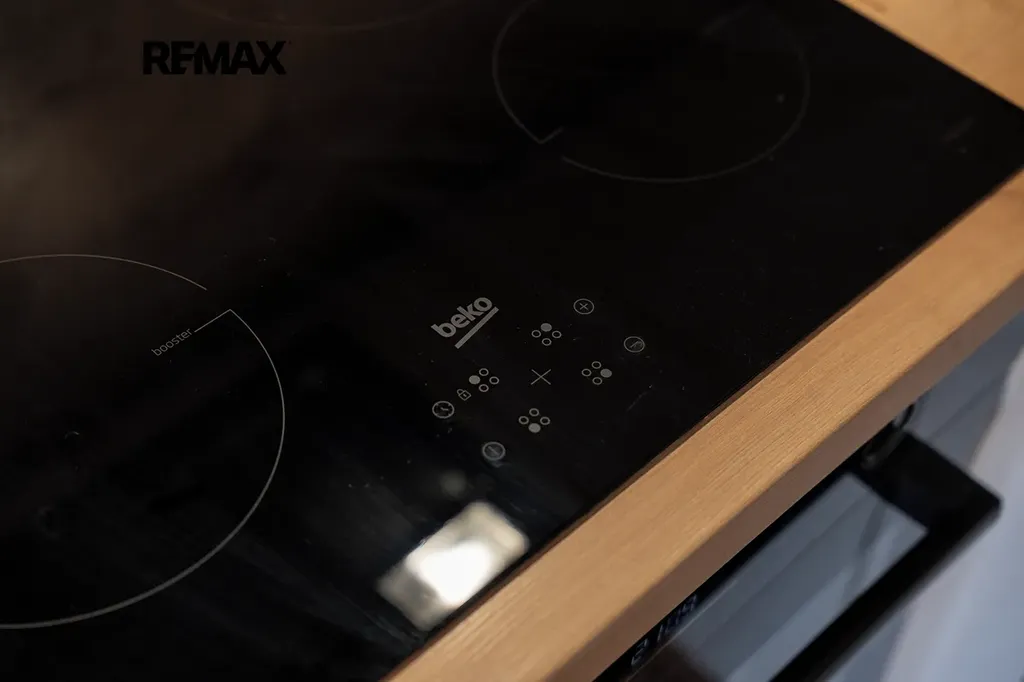 Obývací pokoj spojený s moderní kuchyňskou linkou (trouba, sporák, myčka, lednice).