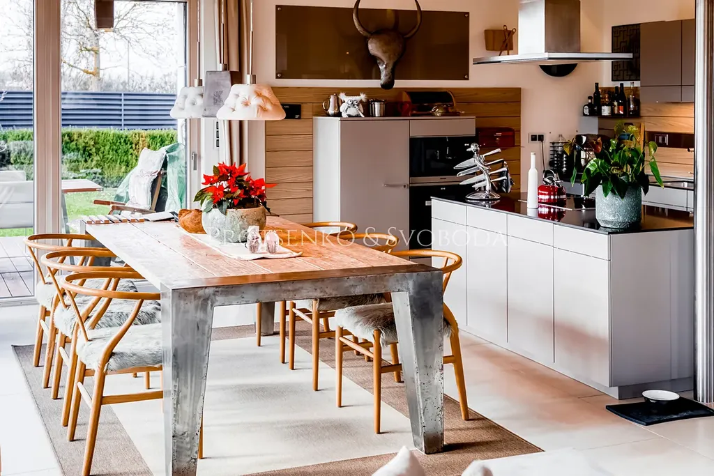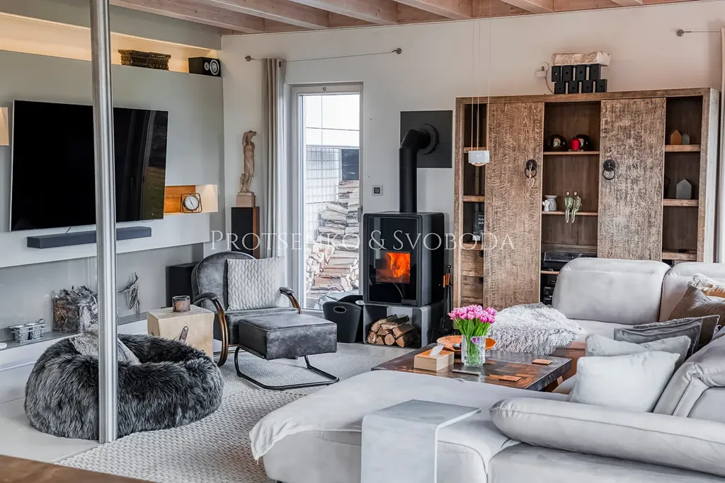 Kuchyně od renomované značky Poggenpohl je vybavena spotřebiči Miele. K posezení lákají židle u masivního ručně vyrobeného jídelního stolu nebo křeslo u krbu. Po dohodě je možné v domě veškeré interiérové vybavení včetně designových solitérů nebo originálních svítidel ponechat. Dům obklopuje zahrada, odkud lze přímo sledovat dění na golfovém hřišti. Na pozemku stojí přístřešek pro auta a dva zahradní domky.