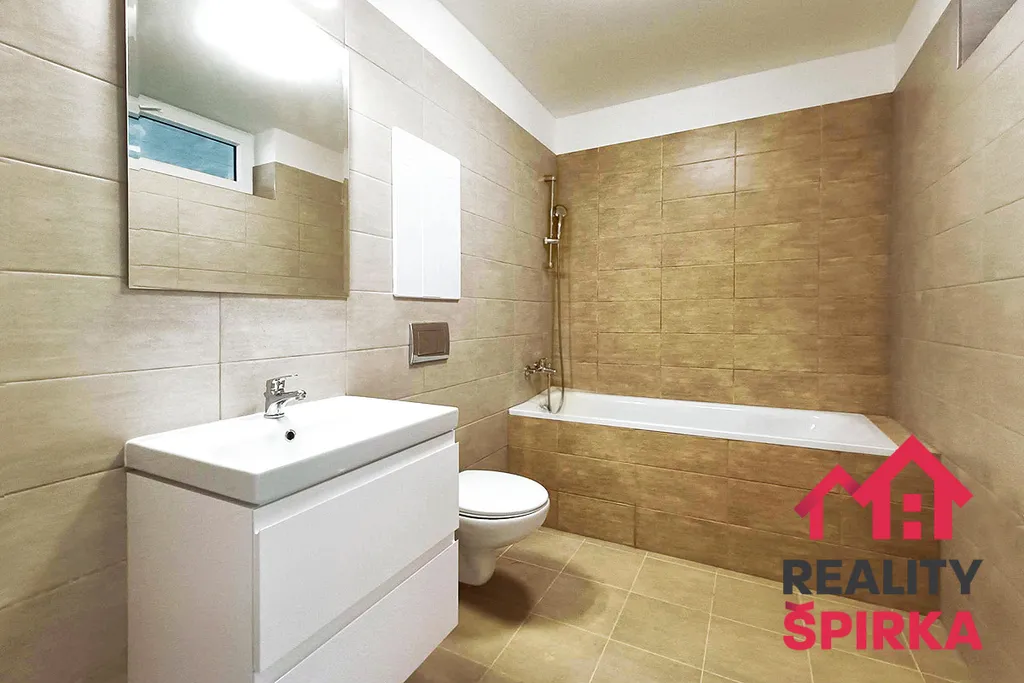 Koupelna s vanou, umyvadlovou skříňkou, zrcadlem, otopným žebříkem a místem pro pračku i sušičku.