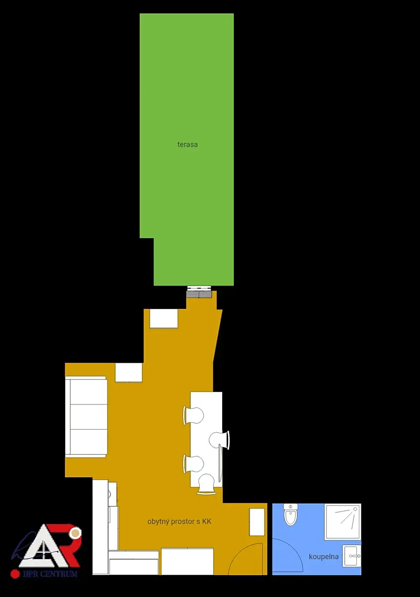 • Obývací část s pohodlným nábytkem – rozkládací sedací souprava, pracovní i jídelní stolek, televize.