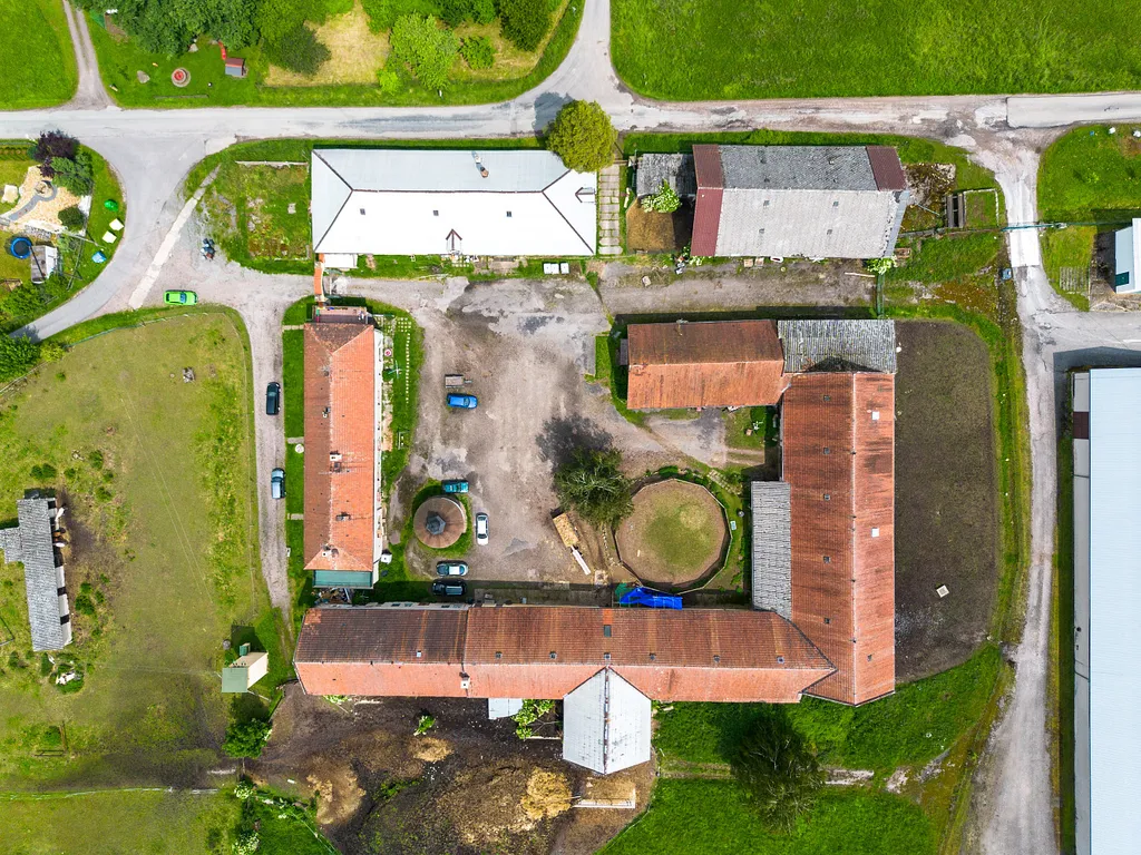 Vezmeme to od začátku. Celý statek, tedy usedlost, leží na celkové ploše 23 296 m² pozemků. Z toho je přibližně 2 900 m² zastavěné plochy. Hlavní budova je dům s pěti byty, který vidíme při příjezdu. Šestý byt je ve vedlejší budově, která se nachází v bezprostřední blízkosti. Zde ve vedlejší budově je možné přidat dalších přibližně pět bytů nebo apartmánů.