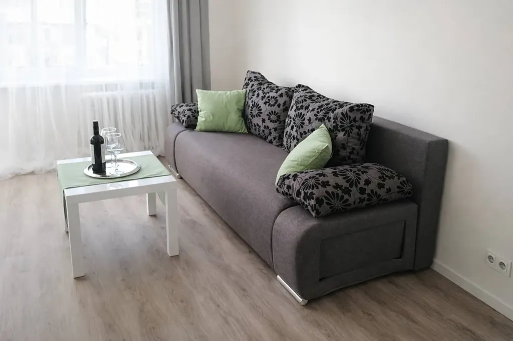 • Obývací pokoj s kuchyňským koutem: Světlý prostor s kuchyňskou linkou, prakticky oddělen posuvnou stěnou z matného skla, která zajišťuje soukromí a flexibilitu využití prostoru.
