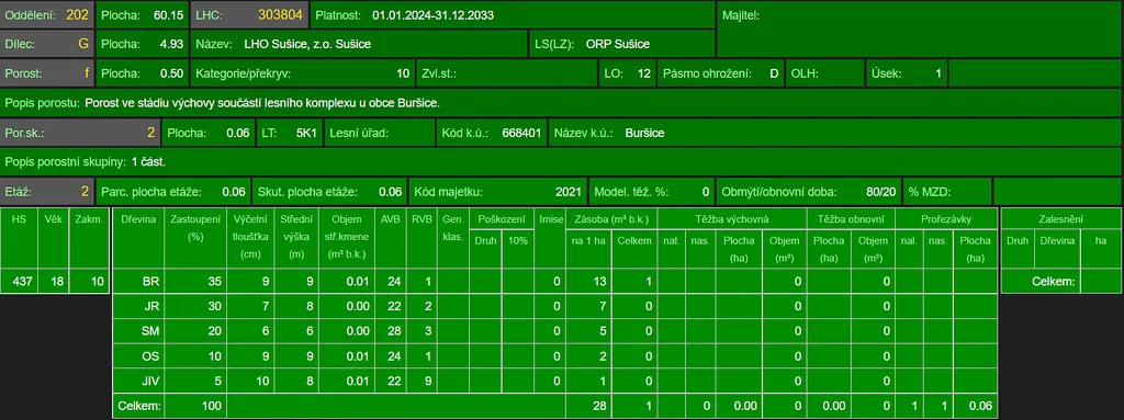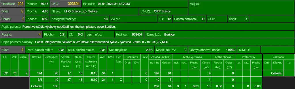 Prodej lesního pozemku a pozemku vedeného jako ostatní plocha v katastrálním území Buršice, obec Kolinec, okr. Klatovy. Jedná se o pozemek p.č. 253, lesní pozemek o výměře 5.147 m² a o pozemek p.č. 376/2, ostatní plocha o výměře 48 m². Celková výměra pozemků činí 5.195 m². Pozemky spolu nesousedí. Lesní pozemek je situován na mírně svažitém terénu s přístupem po nezpevněné státní cestě z vrchní strany a částečně zpevněné lesní cestě ze strany spodní, která pozemek protíná a je jeho součástí. Na ploše lesního pozemku se dle platných LHO nachází lesní porost smrku a břízy ve věku 33 let, lesní porost břízy, smrku, jeřábu a osiky ve věku 20 let a lesní porost smrku, břízy, borovice a jeřábu ve věku 11 let. Foto je aktuální. Informace na tel. nebo e-mailu.