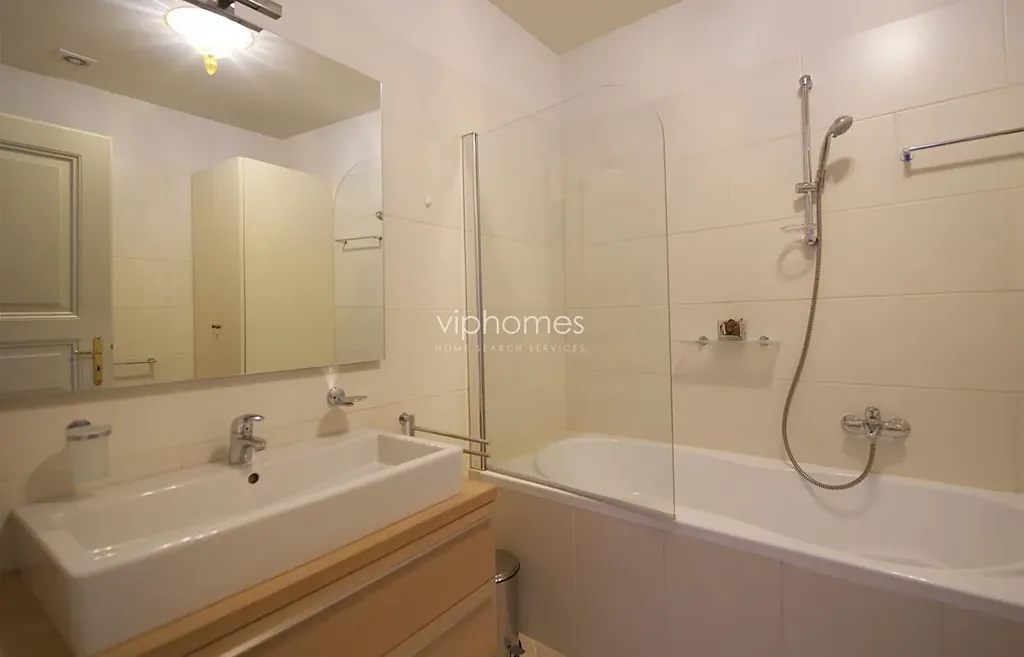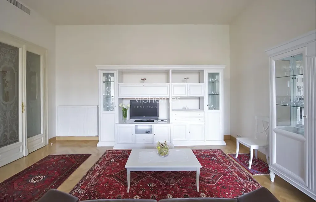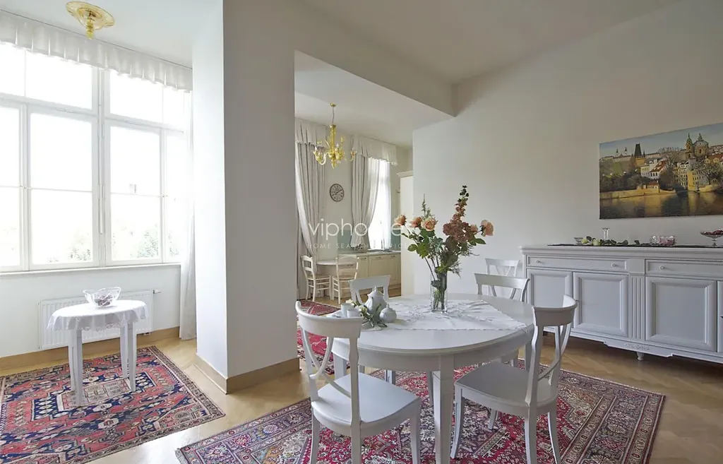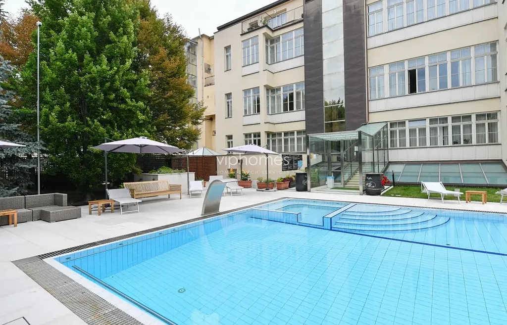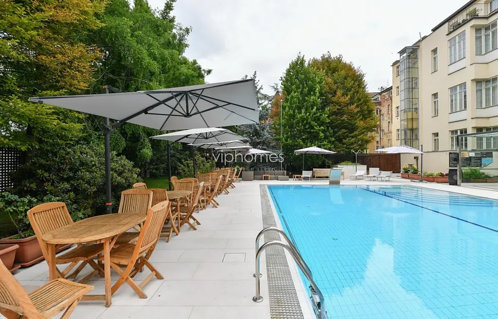 Tento tradičně zařízený byt se nachází ve 2. patře dobře udržovaného činžovního domu s výtahem. Interiér bytu se skládá z otevřeného obývacího pokoje s kuchyňským koutem zařízeným kvalitními spotřebiči, 2 ložnic a 2 koupelen. K vybavení bytu patří pračka se sušičkou, koberce, nádobí, skleničky, kompletní sady hrnců, příbory, perské koberce, LCD televizory, ložní prádlo, bezpečnostní dveře, videotelefon, satelitní TV. Klimatizace. Úklid jednou týdně v ceně. Současně se zachováním všech architektonických prvků je dům vybaven i komfortem pro pohodlné a příjemné bydlení. Obyvatelům domu k dispozici po celý rok vyhřívaný krytý bazén s vodní masáží a sauna. Dále je k dispozici velká rozkvetlá zahrada. Pokud se rozhodnete trávit volný čas v zahradě nebo u bazénu, jen těžko uvěříte, že žijete v takovém velkoměstě, jakým je Praha.
