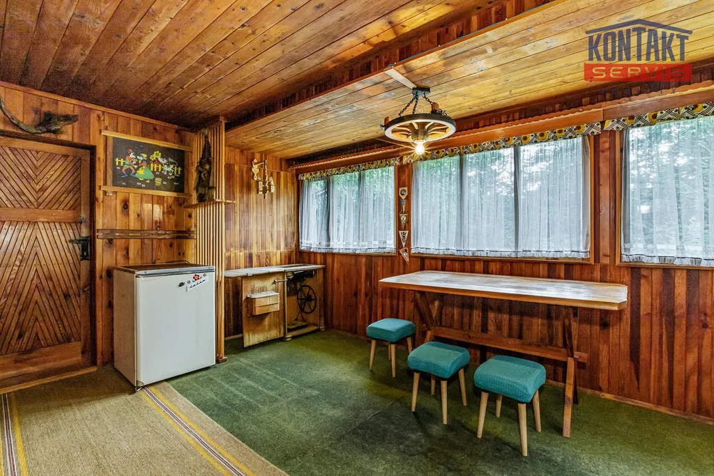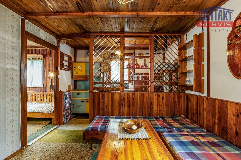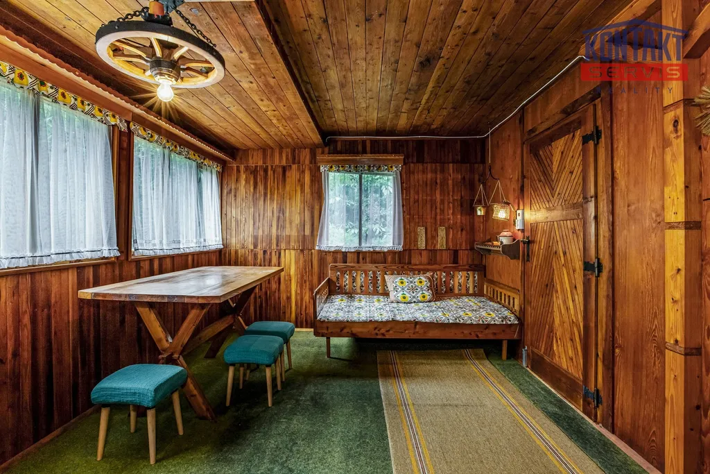Interiér je laděn v tradičním chatařském stylu — barevný, funkční a s duší, což ocení především příznivci klasické rekreační estetiky.