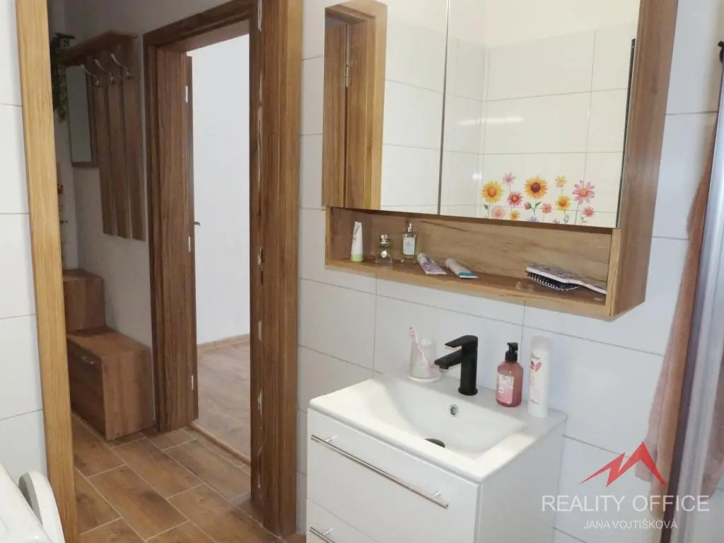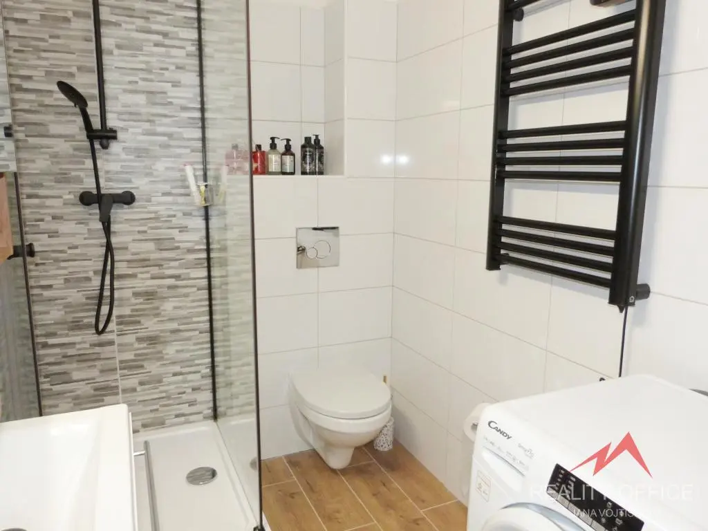 Nové vybavení: Kuchyňská linka je osazena novými vestavěnými spotřebiči. Koupelna je moderně řešena se sprchovým koutem a WC.