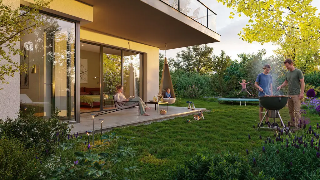 Moderní 4+kk s terasou 16,2 m² a zahradou 188,1 m² – byty jsou čerstvě dokončeny a budou připraveny během pár týdnů k nastěhování.