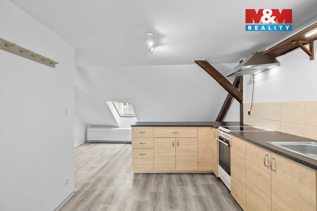 K pronájmu nabízíme prostorný a světlý byt v podkrovní mansardě o dispozici 2+1, situovaný v ulici Chržínská ve Velvarech.