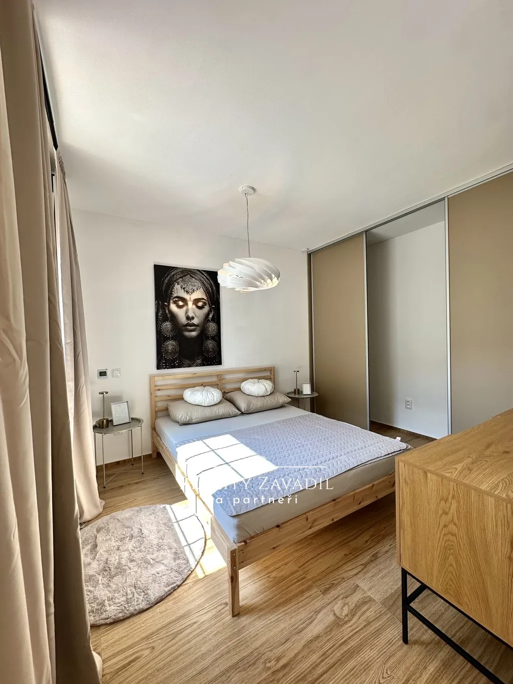 Interiér bytu je navržen v moderním skandinávském stylu s důrazem na kvalitu materiálů a praktické využití prostoru. Obytná část plynule propojuje obývací pokoj s jídelnou a kuchyňským koutem, který je kompletně osazen vestavnými spotřebiči. Prostoru dominují designové prvky v podobě přiznaných stropních trámů a masivních posuvných dveří. Ložnice je vybavena manželskou postelí a dostatečnými úložnými prostory. Koupelna disponuje velkoformátovým sprchovým koutem a moderní sanitární keramikou. Byt se prodává s veškerým zobrazeným vybavením a nevyžaduje žádné další počáteční investice.