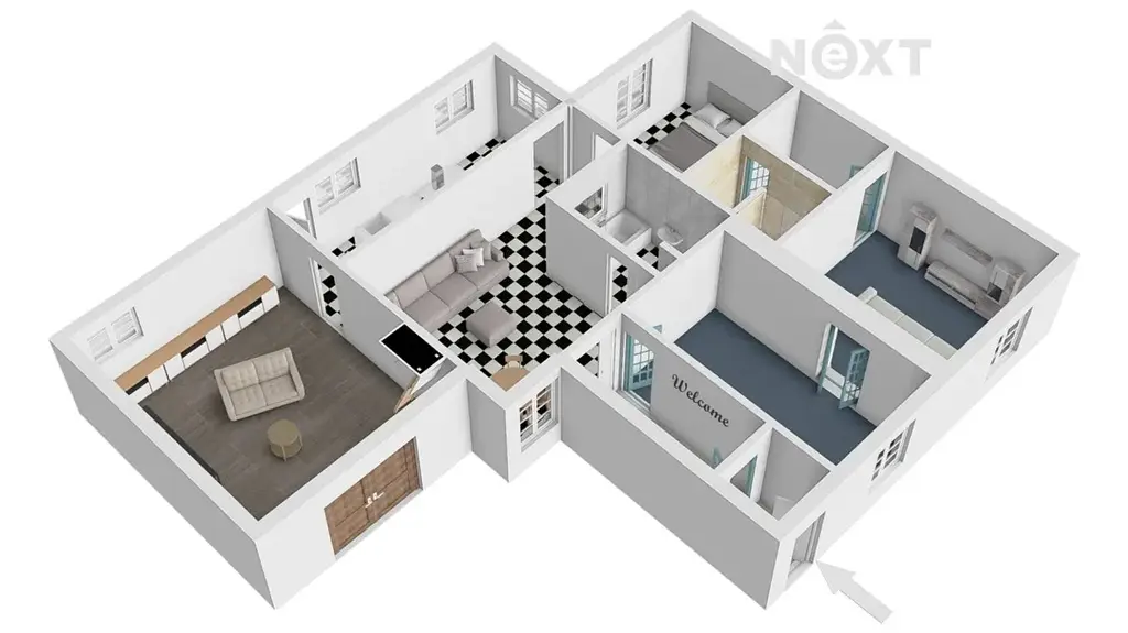 * druhá bytová jednotka 2+1: obývací pokoj (20,5 m2), koupelna s WC (5,7 m2), ložnice (11,8 m2), kuchyně (12,8 m2) Dále je k dispozici společná předsíň a chodba (8 m2), garáž (28,9 m2) a sklep.