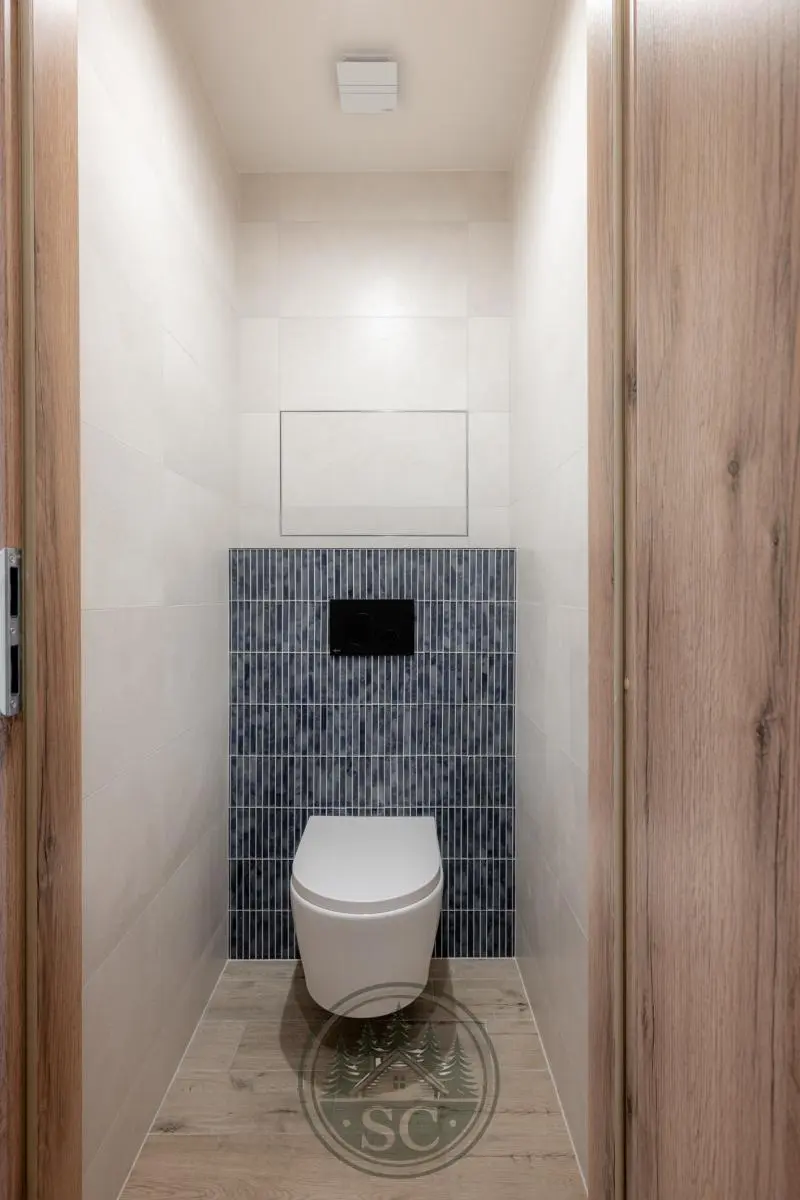 Koupelna nabízí vanu, podsvícené niky s jemným modrým akcentem, zrcadlo s volbou světelného tónu, černé baterie, topný žebřík a skříňky v dekoru dřeva.