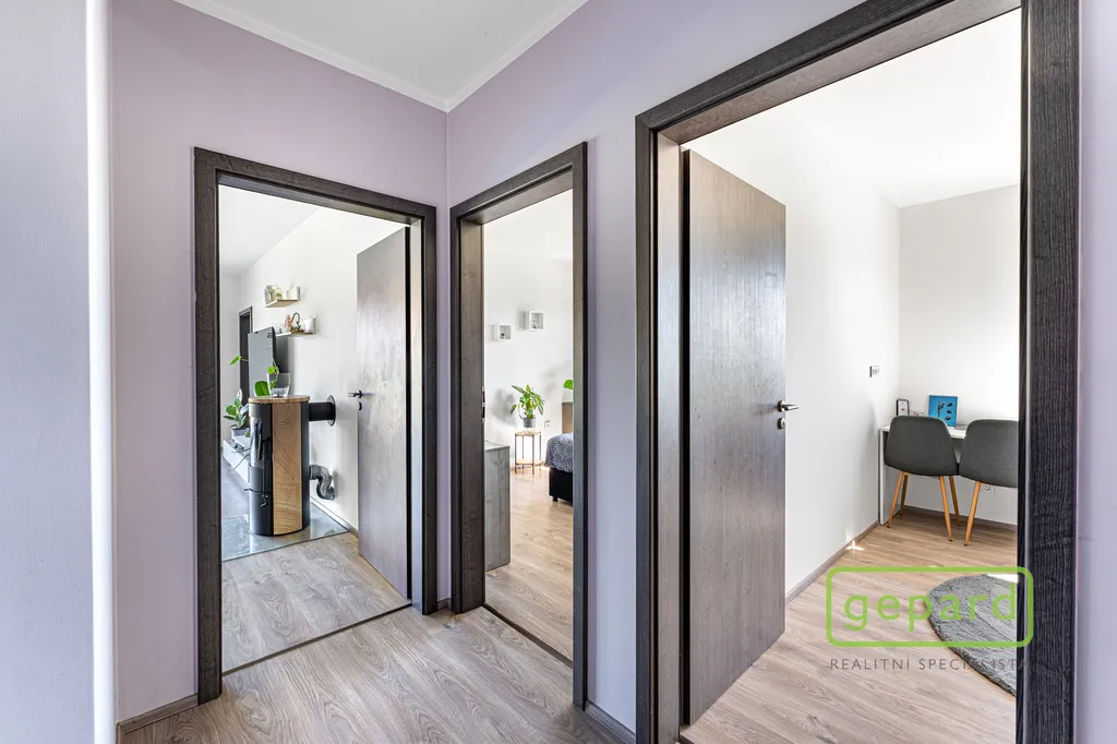 Jedná se o novostavbu s užitnou plochou 90 m², která na první pohled zaujme svým čistým a vzdušným designem. Interiér je laděn do moderních světlých tónů v kombinaci s dekorem dřeva, což celému prostoru dodává útulnou atmosféru. Srdcem domu je prostorný obývací pokoj s kuchyňským koutem, odkud vedou velké prosklené dveře přímo na terasu a zahradu. Dům dále nabízí tři samostatné pokoje, praktickou šatnu a moderní koupelnu, která je vybavena jak vanou, tak praktickou walk-in sprchovým koutem. O komfortní topení v domě se stará vodovodní podlahové vytápění s napojením na elektrokotel.