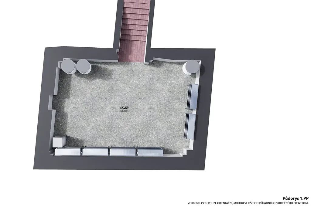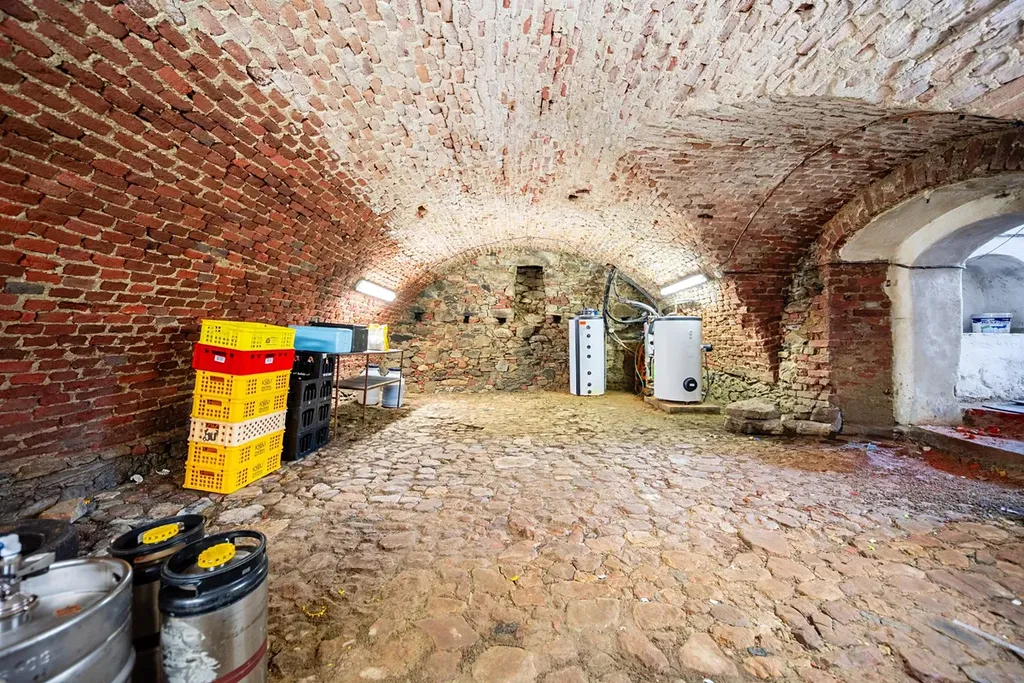 1.PP (70 m2): Rozlehlé sklepní prostory , které v současnosti slouží jako skladové zázemí. Tento prostor nabízí značný budoucí potenciál pro rozšíření konceptu (např. vinný sklep, stylové degustační prostory), budoucí využití je vázáno na schválení příslušnými úřady.