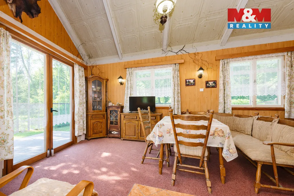 K prodeji útulná dřevěná chata na krásné polosamotě v katastrálním území Nekoř, jen pár minut chůze od oblíbené přehrady Pastvinská přehrada.