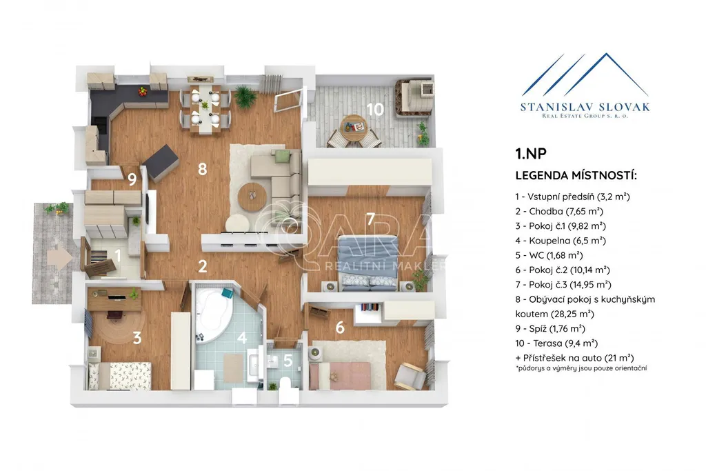 Z obývací části se dostanete francouzskými dveřmi na terasu orientovanou na jihozápad. Stačí ji dokončit a vznikne příjemné místo pro posezení, grilování nebo třeba i vlastní pec. Ložnice o velikosti 14,95 m² nabízí i velkou vestavěnou skříň. Další pokoj o velikosti 10,14 m² je orientovaný na sever směrem do zahrady a dobře poslouží jako dětský pokoj nebo pracovna. Poslední pokoj o velikosti 9,82 m² se nachází u zádveří a je orientovaný na jižní stranu.