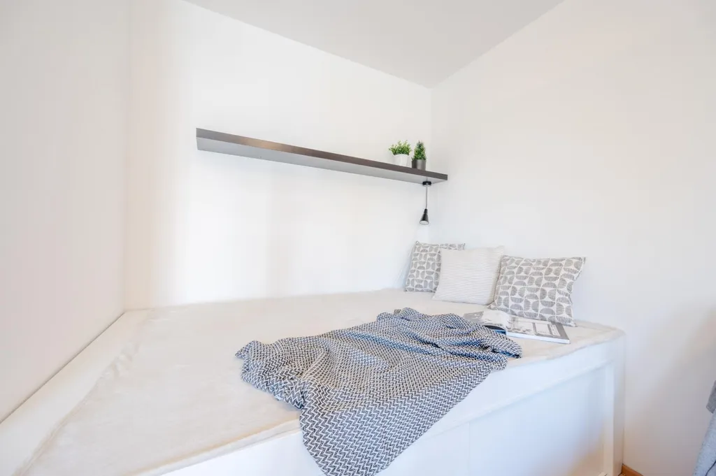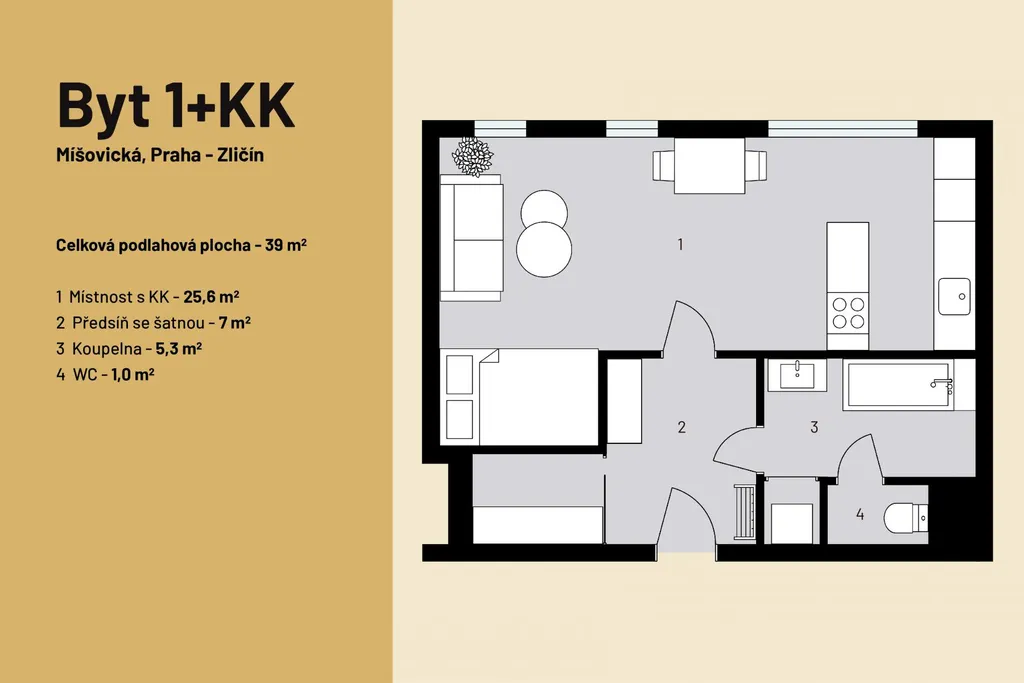 Byt je výborně dispozičně řešený, najdete v něm vše potřebné, skládá se z předsíně, šatny, koupelny (s vanou a umyvadlem), samostatné toalety, technické místnosti (s přípojkou na pračku) a prostorné, prakticky členěné místnosti s kuchyňským koutem (s lednicí, mrazákem, varnou deskou, digestoří a troubou). Kuchyň odděluje ostrůvek od obývací a jídelní části. Prostor na spaní byl vytvořen na míru ve výklenku.