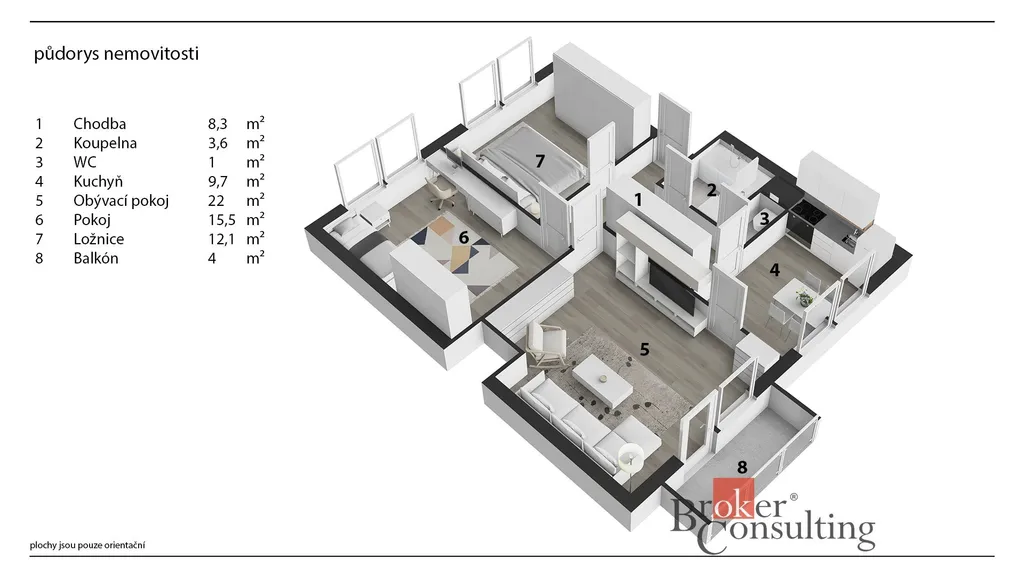 Dispozice bytu tvoří vstupní chodba, koupelna, samostatné WC, kuchyně s kuchyňskou linkou, prostorný obývací pokoj se vstupem na balkon, ložnice a další pokoj, který lze využít jako dětský pokoj, pracovnu nebo pokoj pro hosty.