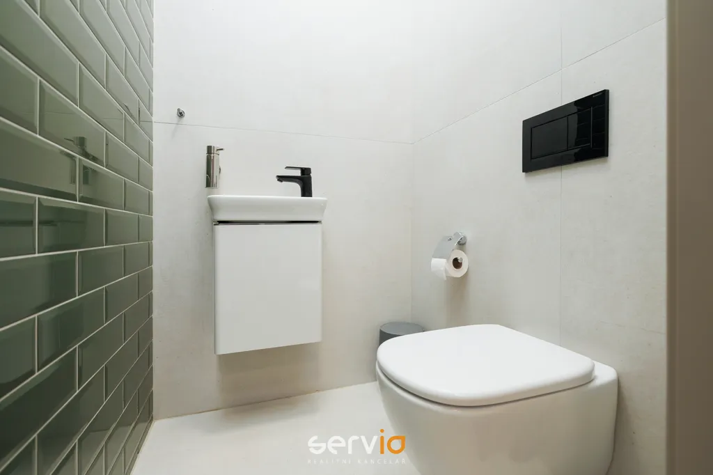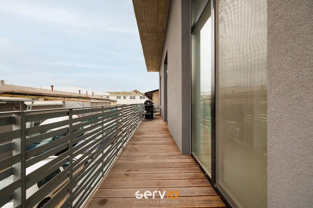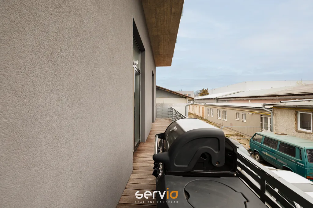 Nadstandardně vybavené prostory se nachází ve 1PP a skládájí se ze 2 neprůchozích pokojů, obývacího pokoje s kuchyní plně vybavenou spotřebiči Siemens, prostorné koupelny se sprchovým koutem, pračkou a sušičkou, samostatného WC, šatny a terasy (18 m2) se třemi samostatnými vstupy.