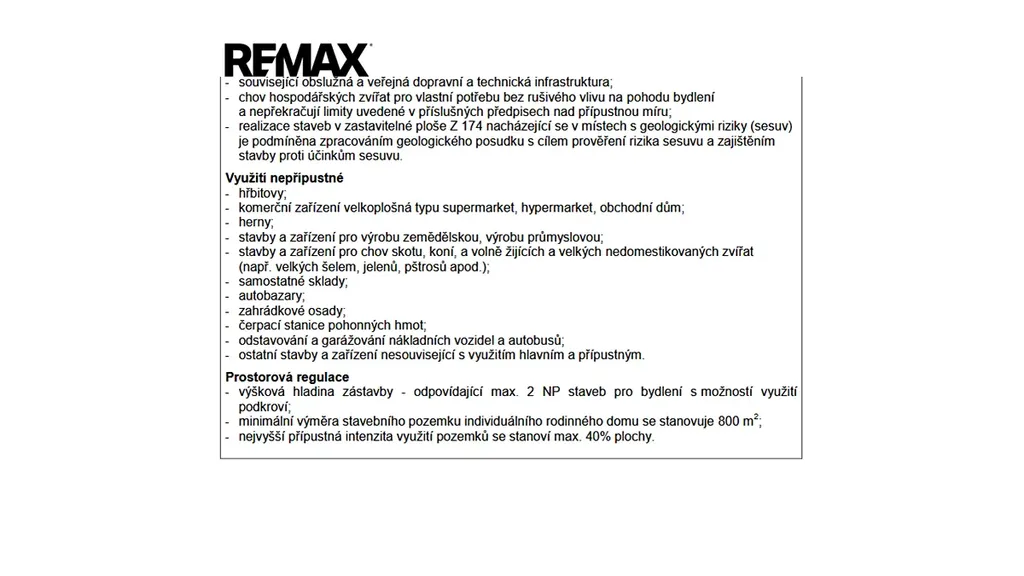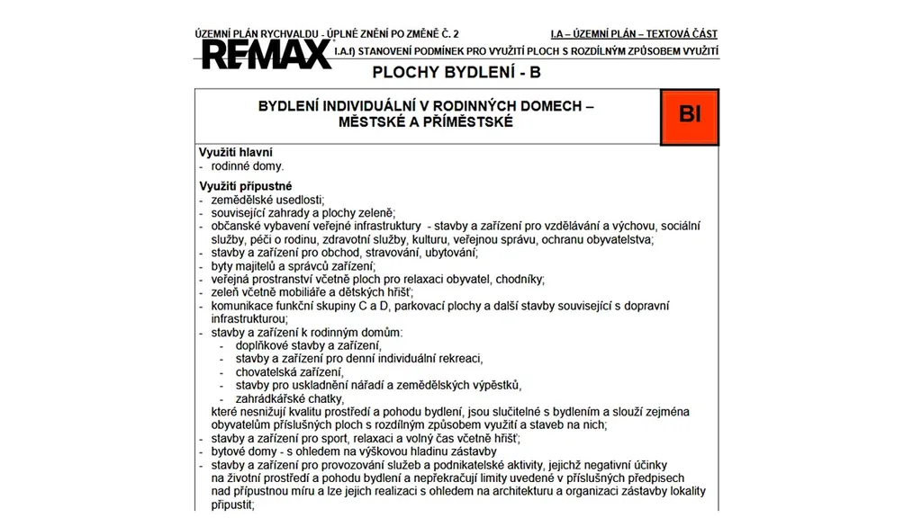 Velkou výhodou pozemků je jejich rovinatý profil, tedy s minimem terénních úprav, s dostatkem slunce po celý den, umístěných ve velice klidné lokalitě mimo hlavní trasy provozu, v obytné zástavbě převážně novostaveb moderních rodinných domů. Dle územního plánu obce jsou pozemky vedeny v zastavitelném území, BI – bydlení individuální, s podmínkou realizace staveb do výšky 2.NP, s min. plochou pozemku 800m² a mírou intenzity využití pozemku pro výstavbu max. 40% plochy.