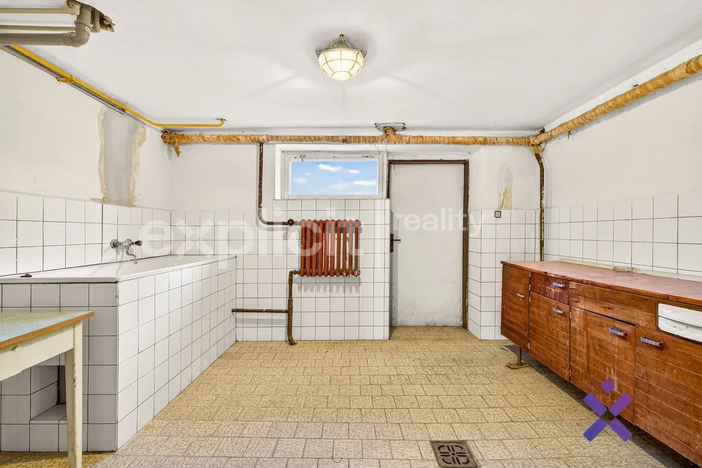 Suterén o velikosti přibližně 70 m² zahrnuje sklepní prostory i garáž přístupnou přímo z domu. Do zahrady lze vstoupit z obou stran domu. Z jedné strany je široká dvoukřídlá brána, druhá strana nabízí pěší průchod kolem domu.