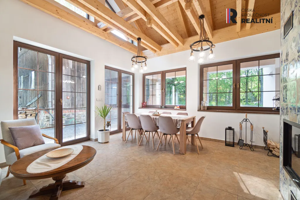 V objektu se nachází velká prosklená jídelna s krbem a vintage kuchyní, další 4 pokoje (ložnice), 2 koupelny (toaleta, vana, sprcha), další samostatné WC a technická místnost. Ložnice v přízemí jsou zařízeny malovaným dřevěným nábytkem, horní pokoje jsou též upraveny jako ložnice. Vintage kuchyně s novou troubou a sklokeramickou deskou a dalšími spotřebiči, jídelním stolem pro 8 osob. Vytápění nemovitosti a ohřev teplé vody je řešen tepelným čerpadlem systémem vzduch/voda. TV a internetové připojení je poskytováno přes bezdrátové Wi-Fi.