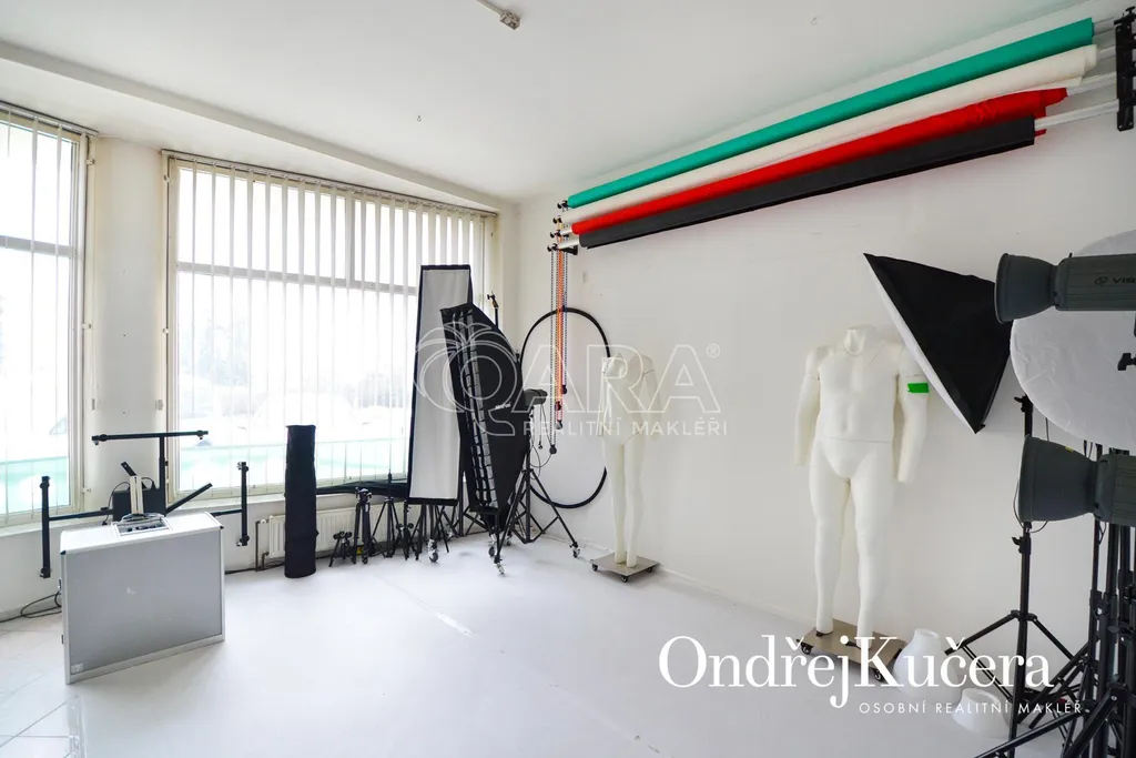 V přízemí je prostorný ateliér o rozloze 125 m², ideální pro galerii, showroom či kancelářské prostory. V prvním patře je světlý a prostorný byt 2+kk o ploše 97 m², přístupný točitým schodištěm z přízemí, což zajišťuje jedinečné propojení pracovního a soukromého prostoru. Vhodné také na investici, protože momentálně je dům obsazen dobrými nájemníky.