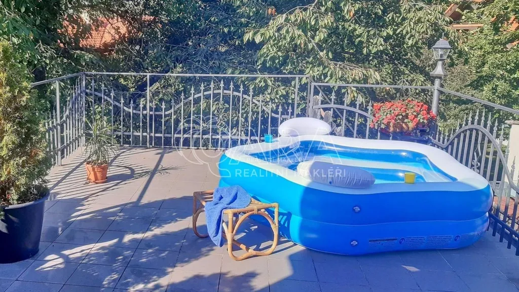 Prostorná terasa (28 m2) nabízí příjemné posezení v soukromí s výhledem do zeleně, s možností grilování, nebo osvěžení v bazénku.