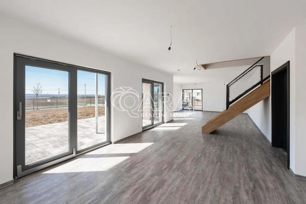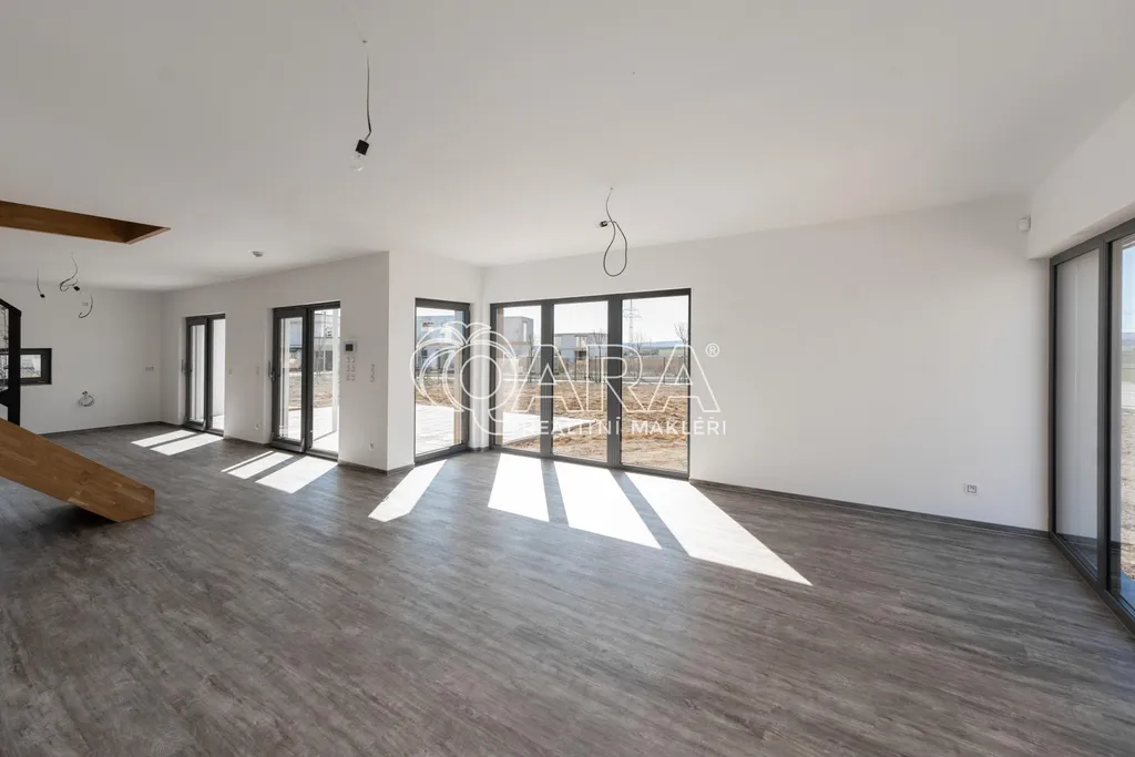 Interiér domu je navržen s důrazem na prostor, světlo a propojení se zahradou. Velkoformátová okna přivádějí do domu dostatek denního světla a vytvářejí příjemnou atmosféru. Dům je připravený k okamžitému nastěhování.