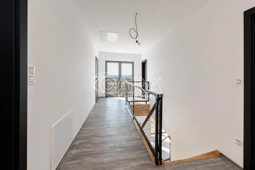 Vinylové podlahy a dlažby, okna s trojskly, kvalitní interiérové dveře, designové schodiště s dřevěnými nášlapy, kompletní sanitu, regulaci vytápění, oplocení, vsakovací nádrž na dešťovou vodu, videotelefon a elektrickou vjezdovou bránu.