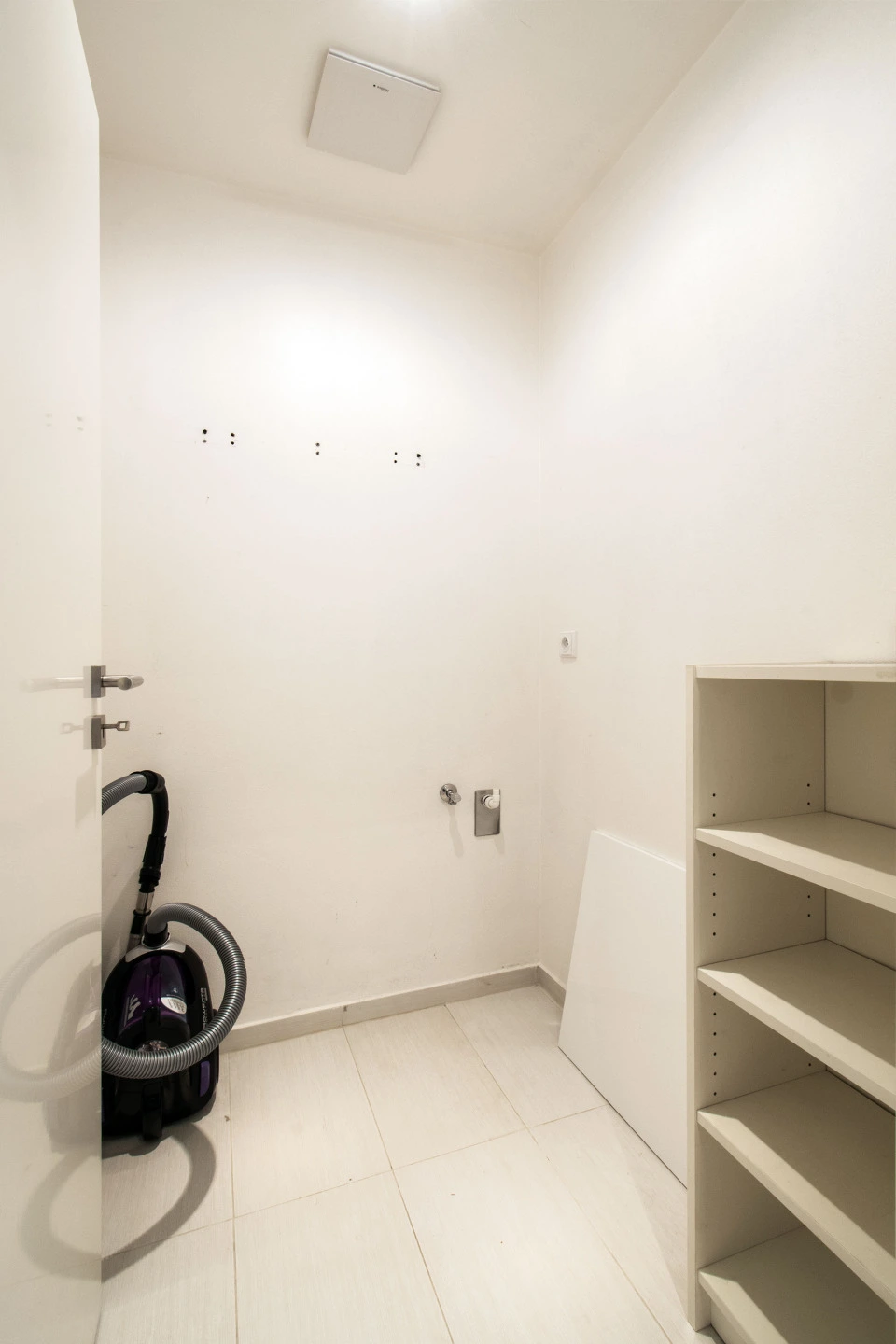 Byt se nabízený vybavený. Moderní kuchyňská linka disponuje sklokeramickou deskou s designovou digestoří, dále pak vestavěnou elektrickou troubou, myčkou a lednicí s mrazákem. Kuchyně nabízí dostatek úložného místa i praktický jídelní stůl. Z kuchyňského koutu vidíme na obývací část s pohovkou, taburetkem, poličkou, TV stolkem a samotnou TV na stěně. Z této místnosti je vstup na balkon. Z předsíně se dále dostaneme do koupelny s vanou, umyvadlem a zrcadlem, spolu s pračkou, žebříkem a policovým systémem. Další oddělenou místností je samostatná toaleta rovněž s policovým systémem i malým umyvadlem. Součástí předsíně je i šikovná úložna komora s úložnými prostory a vysavačem. V koupelně, toaletě i komoře je stropní odsávání pro eliminaci vlhkosti. Poslední důležitou místností je ložnice, nabízena nezařízená až na prostornou bílou šatní skříň.