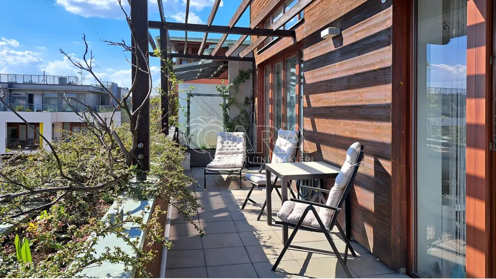 Dominantou je obývací pokoj s plně vybavenou kuchyní (trouba, myčka, lednice, indukce) a přímým vstupem na téměř 20 m² terasu. Ta nabízí posezení i dostatek soukromí ideální pro ranní kávu i večerní relax.