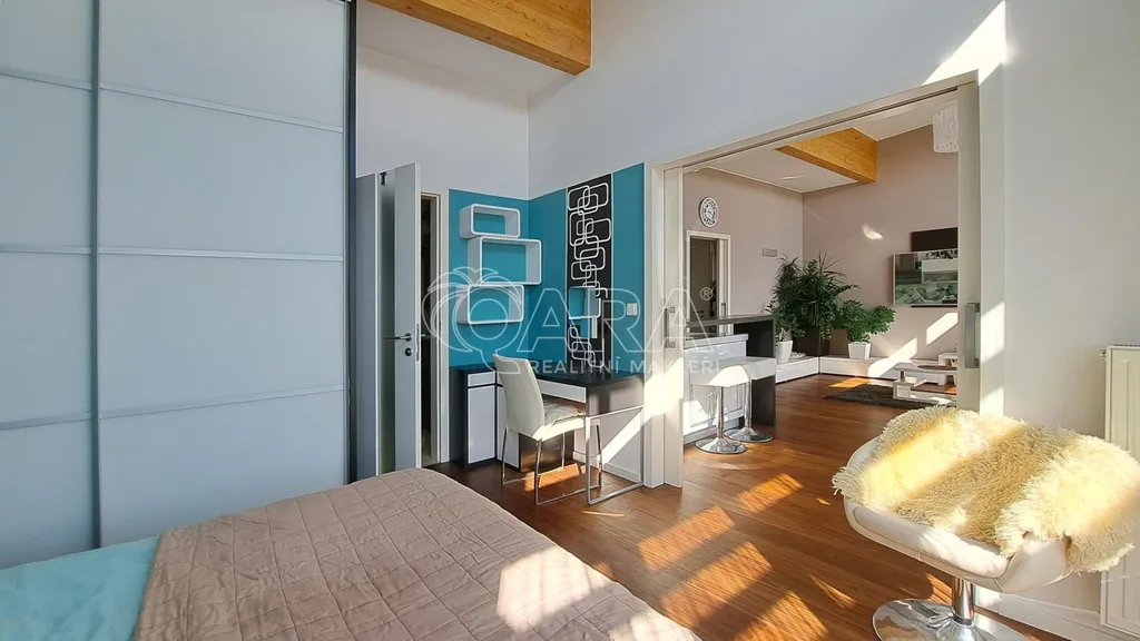 Byt o celkové ploše 76,14 m² (56,18 m² byt + 19,96 m² terasa) se nachází v moderním domě se solárními panely a zaujme světlým, vzdušným interiérem s dřevěnou podlahou a příjemnou atmosférou doplněnou zelení.