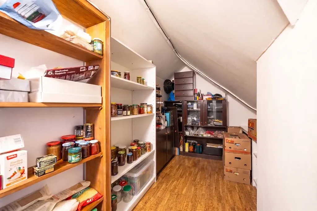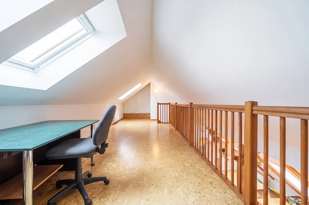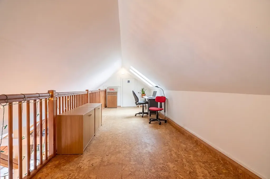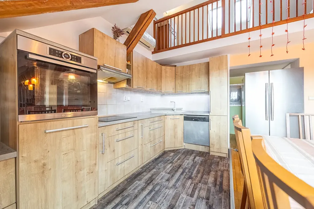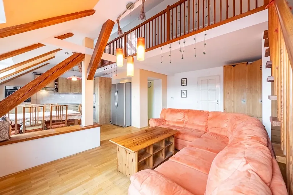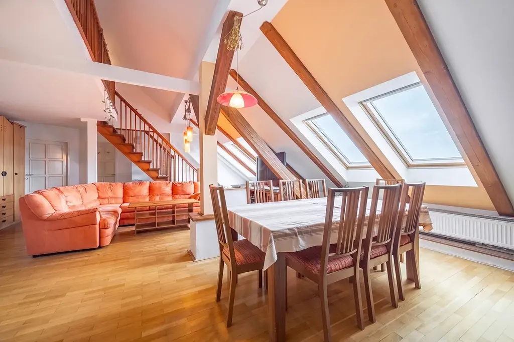 Dominantou bytu je velkorysý otevřený obývací prostor s kuchyní, který působí díky podkrovní architektuře mimořádně světlým a vzdušným dojmem. Otevřený strop, přirozené světlo a plynulé propojení jednotlivých částí vytvářejí ideální místo pro rodinný život i reprezentativní setkávání s přáteli.