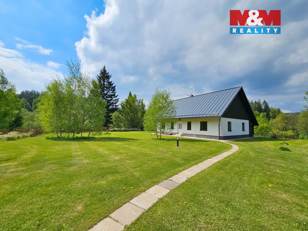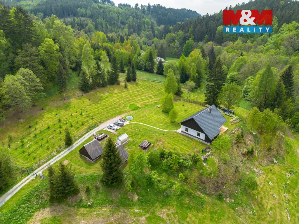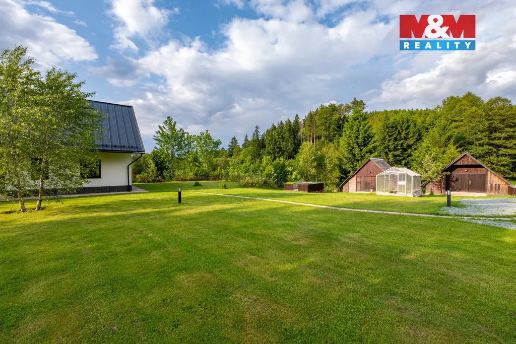 Prodej unikátní novostavby z roku 2022 s rozsáhlým oploceným pozemkem 8649 m², včetně dalších čtyř stavebních parcel (1253 m², 1107 m², 1192 m² a 782 m²) v lokalitě Čížkův mlýn, Nový Hrádek - Rzy. Dům o obytné ploše 110 m² v podhorském stylu stojí na vyvýšeném souboru parcel, oddělených lesem a terénem pro maximální soukromí. Součástí je dílna a 2 chatky. Přístup z obecní cesty (150 m od asfaltové silnice), pozemkem vede vlastní zpevněná cesta. Dům má 2 ložnice, obývací pokoj s HS portálem a nádherným výhledem, pracovnu, jídelnu, kuchyň, technickou místnost s WC a koupelnu s vanou i sprchou. Je postaven z nadstandardních materiálů, cihly s vnitřní izolací, VPC tvárnice, betonové stropy, masivní dubové podlahy a lakovaná hliníková střecha. Vytápění a ohřev vody zajišťuje úsporné tepelné čerpadlo. Připravená možnost rozšíření o velkorysé podkroví s vestavbou schodiště místo pracovny. Voda z vlastní studny. Ideální pro trvalé bydlení i rekreaci v jedinečné lokalitě obklopené přírodou.