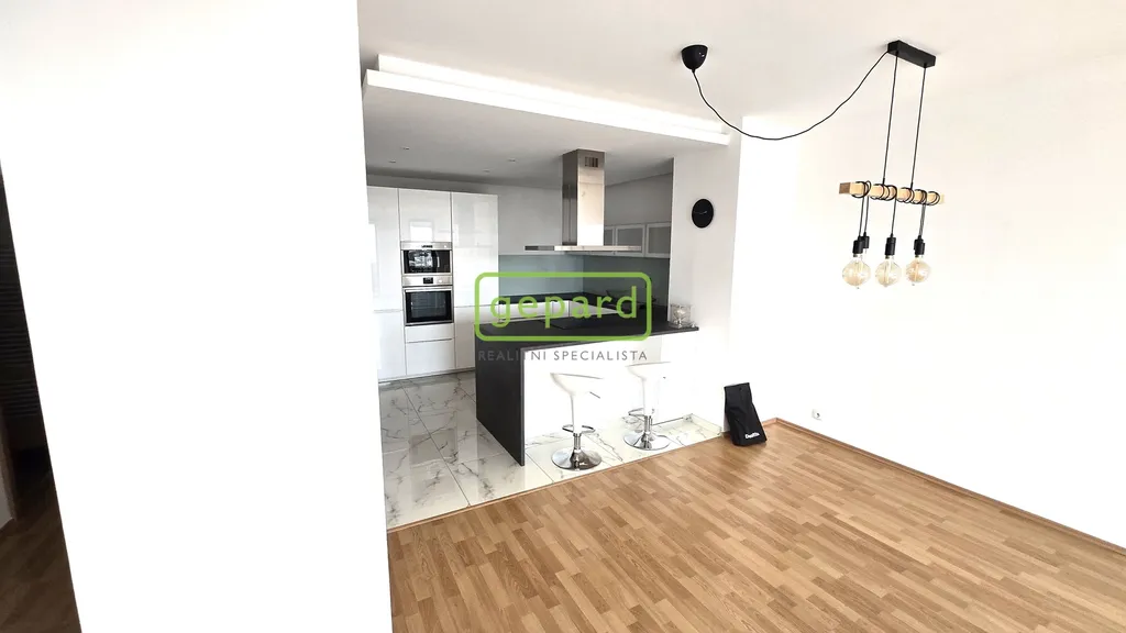 Kuchyňská linka je vybavena myčkou, varnou deskou, troubou a lednicí s mrazákem, disponuje ostrůvkem.