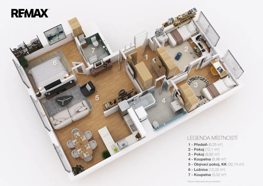Samozřejmostí jsou vestavěné skříně Woodface ve všech pokojích i na chodbě, klimatizace ve dvou místnostech, nová elektroinstalace, podlahy i plastová okna. Praktická komora přímo naproti bytu (1 m²) nabízí další úložný prostor.