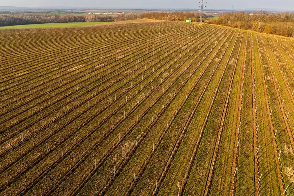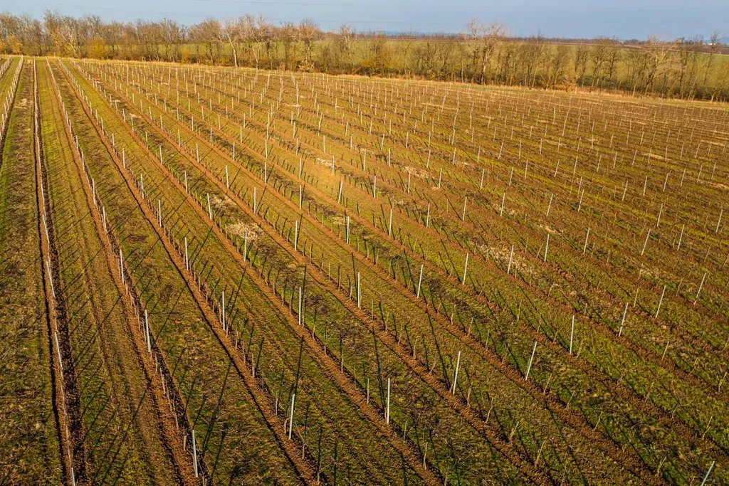 Vinohrad je vybudován na plechových sloupcích a na ploše 6 hektarů jsou instalovány speciální rozpěrky na prostřední dvoudrátí pro snazší manipulaci s letorosty.