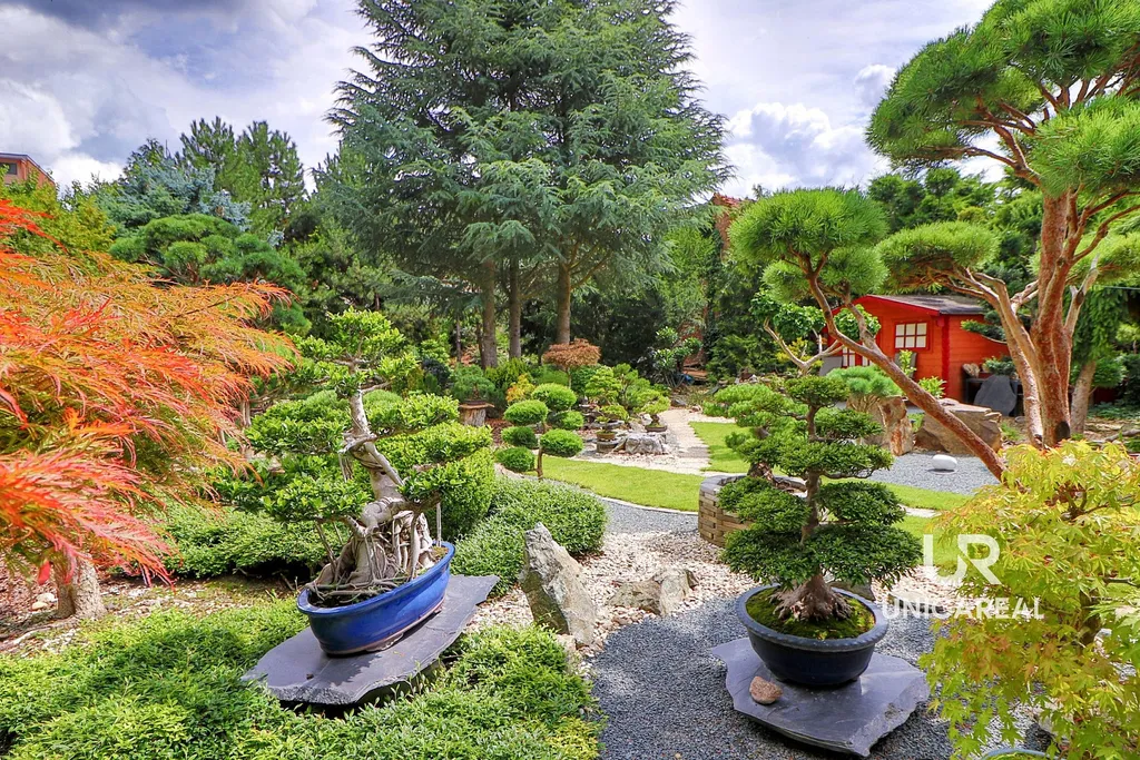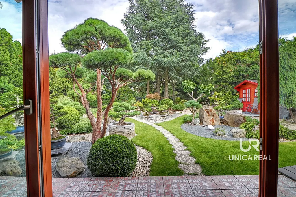 • K domu náleží také okrasná zahrada v japonském stylu s jezírkem a zahradním domkem, která dotváří jedinečnou atmosféru domu. Zahrada má velikost 785m², je prosluněná a do detailu vyladěná. Z terasy o velikosti 17,16m² se můžete večer kochat krásnými pohledy na osvětlenou zahradu.