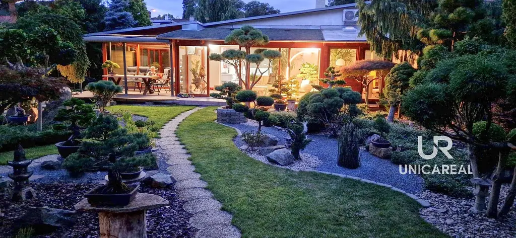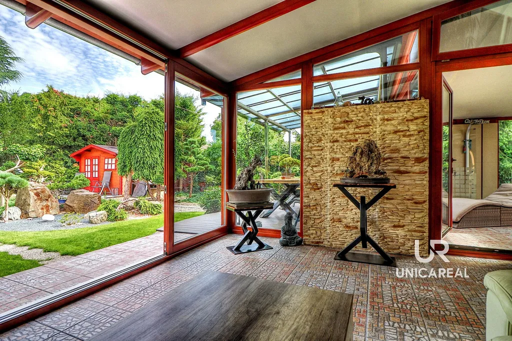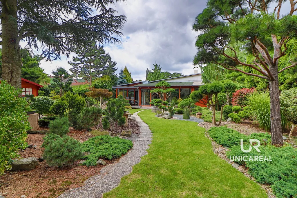 • K domu náleží také okrasná zahrada v japonském stylu s jezírkem a zahradním domkem, která dotváří jedinečnou atmosféru domu. Zahrada má velikost 785m², je prosluněná a do detailu vyladěná. Z terasy o velikosti 17,16m² se můžete večer kochat krásnými pohledy na osvětlenou zahradu.