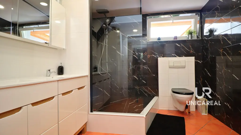 • Jedná se o bezbariérový dům 4+kk o velikosti 125m² s moderním vybavením a dominantním obývacím pokojem + prosklené, vyhřívané wellness zázemí o užitné ploše 74m² . V hlavní ložnici s výhledem do zahrady je šatna a koupelna s parním boxem. Dům má ještě druhou prostornou a designovou koupelnu a technickou místnost kde je instalován střídač a baterie na výkonnou fotovoltaickou elektrárnu.