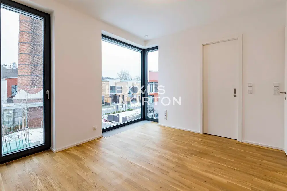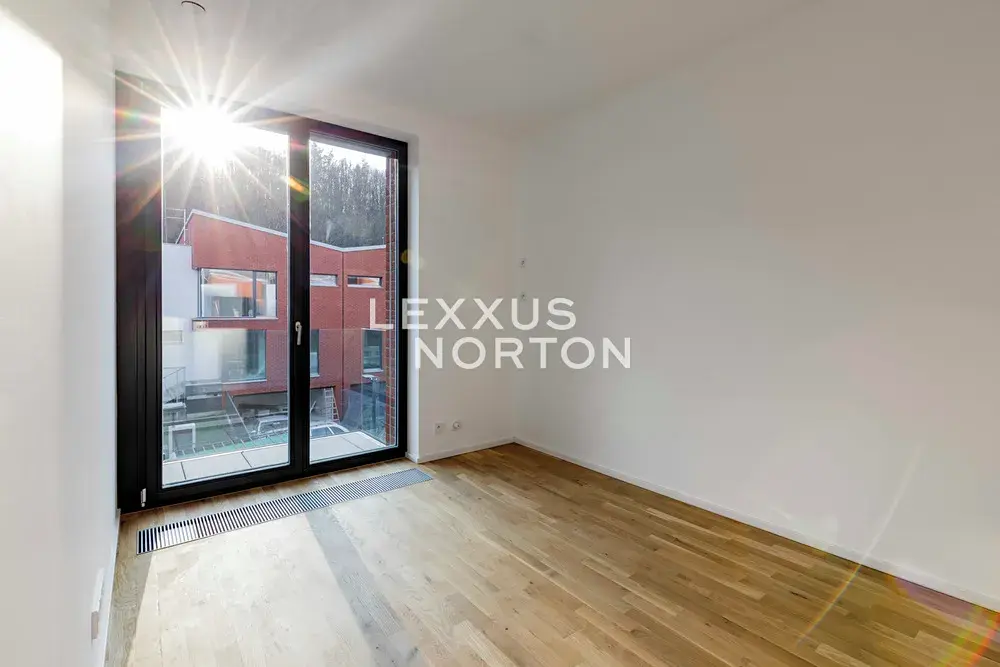 Dispozice domu zahrnuje prostornou vstupní halu, vzdušný obývací pokoj propojený s jídelnou a plně vybaveným moderním kuchyňským koutem, čtyři ložnice, tři koupelny, šatnu, prádelnu, fitness místnost a technické zázemí. K domu náleží také balkon, terasa se zahradou a dvě garážová parkovací stání.